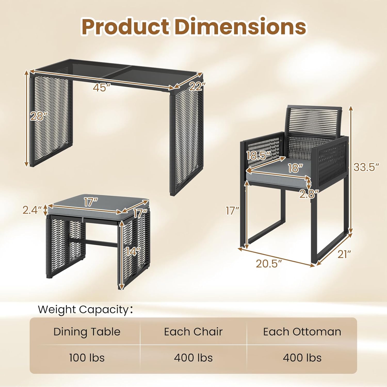Multifunctional Ottomans: The ottomans are not just for resting your feet. They can also serve as extra seating when needed. Each ottoman can support up to 400 lbs, making them sturdy and reliable to accommodate guests.