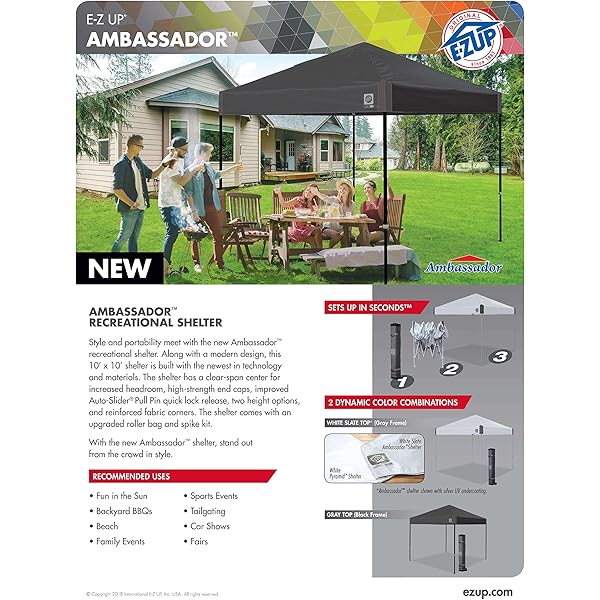E-Z UP Ambassador - Toldo de Refugio instantáneo, 10 x 10 pies, Bolsa de Rodillo y Juego de 4 Pinchos, Pizarra Blanca Blanco pizarra Toldo de refugio