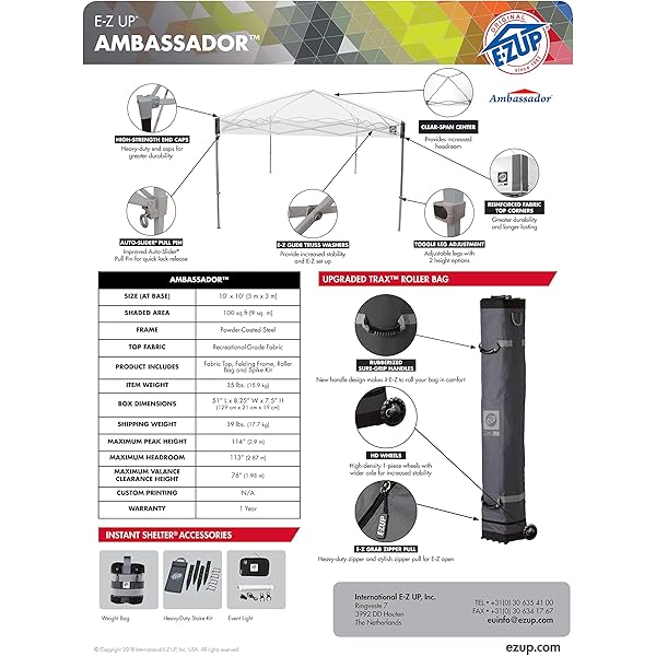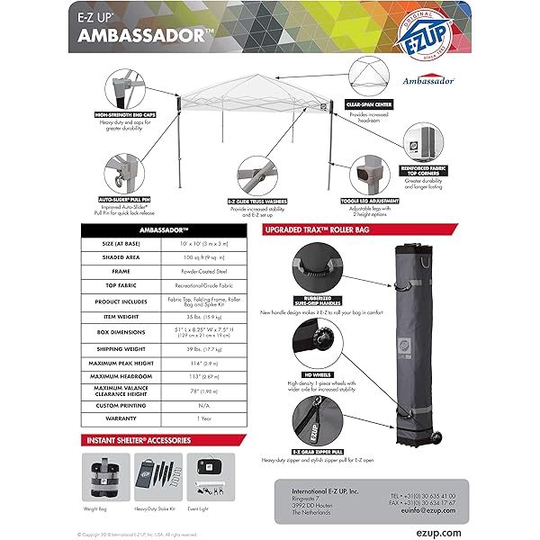¡E-Z UP te tiene cubierto! Creemos en nuestros productos y te ofrecemos una garantía de 1 año que cubre el desgaste normal en todas las piezas de repuesto y toldo. Material del techo: poliéster. Resistente al fuego / 99% de protección UV: el toldo cumple con los requisitos CPAI-84 resistente al fuego, así como ofrece un 99% de protección UV. Distancia de la cenefa: 78 pulgadas. 2 ajustes de altura: tres ajustes de altura diferentes te permiten elegir la altura que mejor se adapte a tus necesidades. Opciones de altura máxima: 9 pies 6 pulgadas, bajo 9 pies 2 pulgadas. Altura de la cenefa: alto 6' 6", bajo 6'2. Nota: las ruedas están incluidas dentro de la caja de cartón maestra. Se instala en segundos: los toldos E-Z UP se instalan en segundos sin necesidad de herramientas. Simplemente saca el marco totalmente montado con la parte superior de la bolsa, tira de abrir, extiende las patas y listo. El desglose es igual de fácil con los ajustes de pierna de botón y grandes trabillas de pin. Se pliega y se pliega para colocarlo en la bolsa de almacenamiento con ruedas. El equipo opcional del embajador incluye: kit de estaca de lujo, bolsas de peso E-Z UP, luz de evento, pared lateral y media pared. Máximo espacio exterior: el techo transparente proporciona un mayor espacio de hasta 9 pies 5 pulgadas en el interior. El marco interior único no tiene barras transversales que atraviesan el centro del toldo. El Ambassador tiene una distancia de cenefa de 6 pies y 6 pulgadas. Altura máxima exterior de 9 pulgadas y 6 pulgadas. Se pliega hasta 4 pies 3 pulgadas de alto. 100 pies cuadrados de sombra: el diseño de pierna recta tiene una huella de 10 pies por 10 pies y una cobertura de 10 pies x 10 pies en la parte superior.