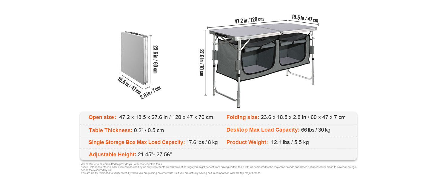 Setup in Seconds: You can easily unfold and pack the portable cook station up, and it can be taken apart in less than several minutes without any tools. The slim-fold table is only 2.8 inches (7 cm) thick, so it won't take up too much space.
