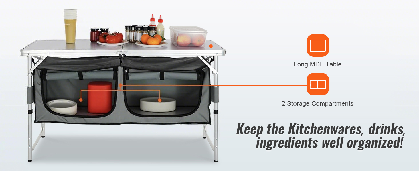 Great Space Management: Our camping kitchen table is designed to take your kitchen outside! You can organize your food, stoves, grills, and cookware in an orderly manner on the tabletop, and zippered storage compartments.