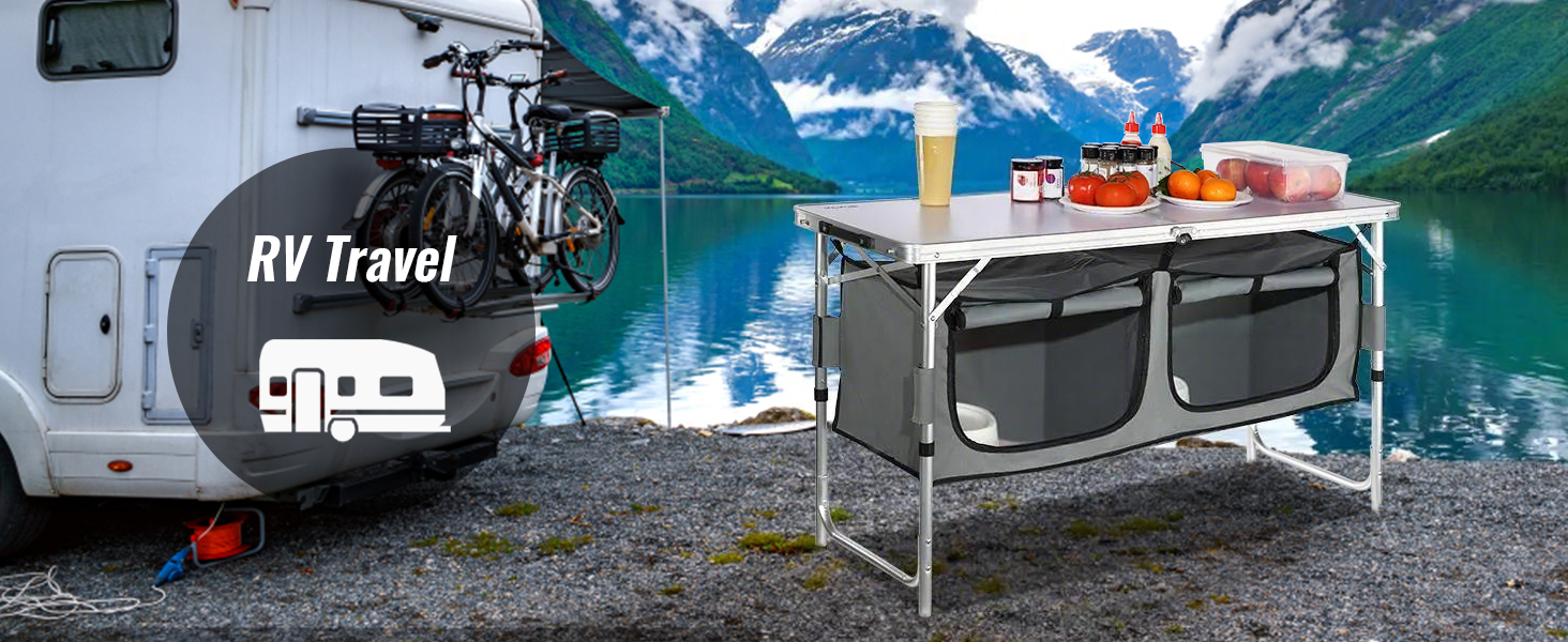 Ready for Any Adventure: Whether you're RV traveling, camping, picnicking, hosting a backyard BBQ, or just enjoying a night under the stars, our camping table is the ideal solution for all your outdoor needs. It provides a sturdy surface for placing and storing items while enhancing your overall outdoor experience.